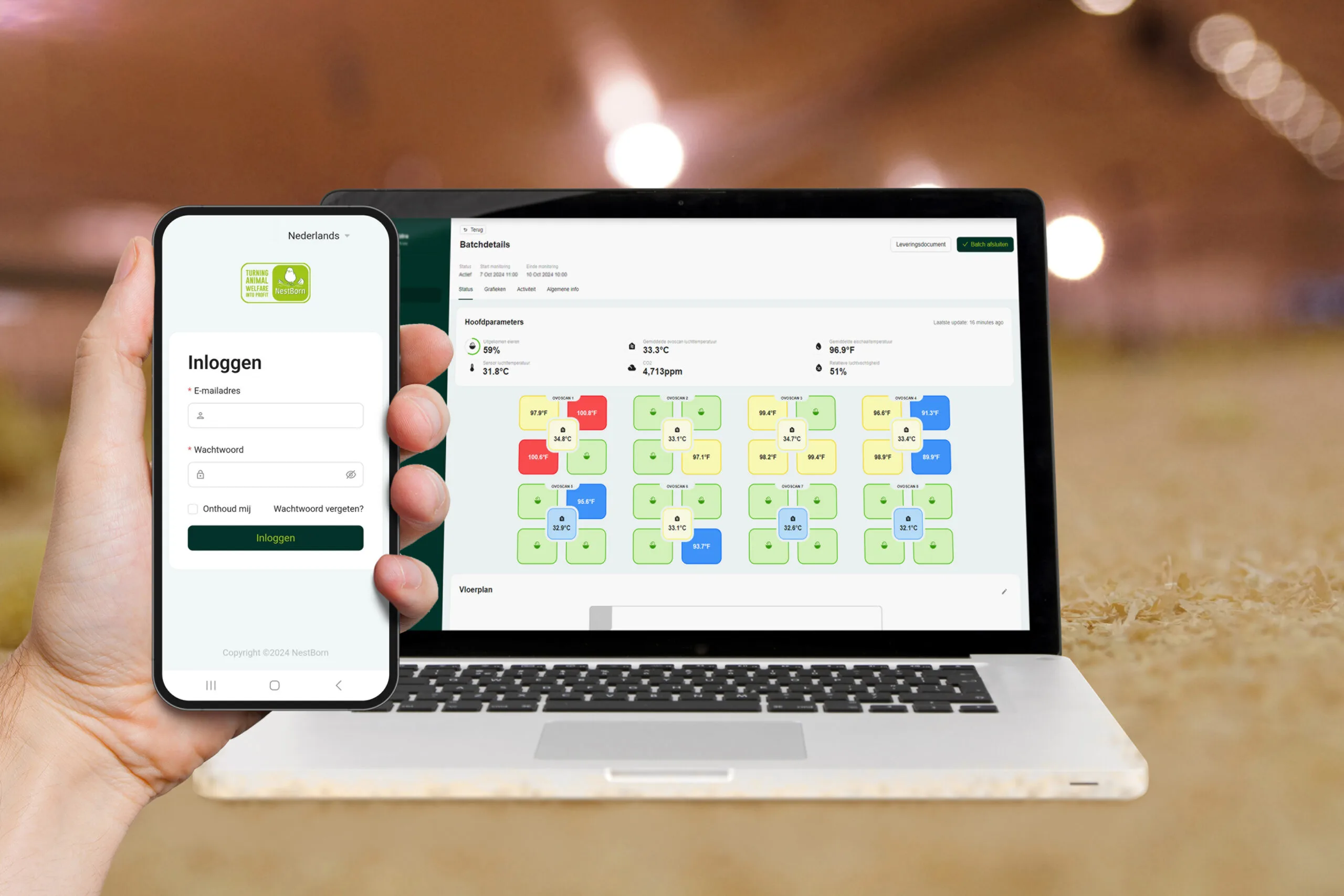 Om zeker te zijn dat het driedaagse uitkomstproces goed verloopt, plaatsen we unieke draadloze Ovoscan-sensoren tussen de eieren. Dit unieke monitoringssysteem meet 24/7 de eischaaltemperatuur en het klimaat in uw stal. Op uw smartphone, tablet of PC kunt u het volledige uitkomsttraject in real-time en vanaf afstand volgen. Een keer een demo van dit Monitoringssysteem bekijken? Neem contact met ons op voor een afspraak!